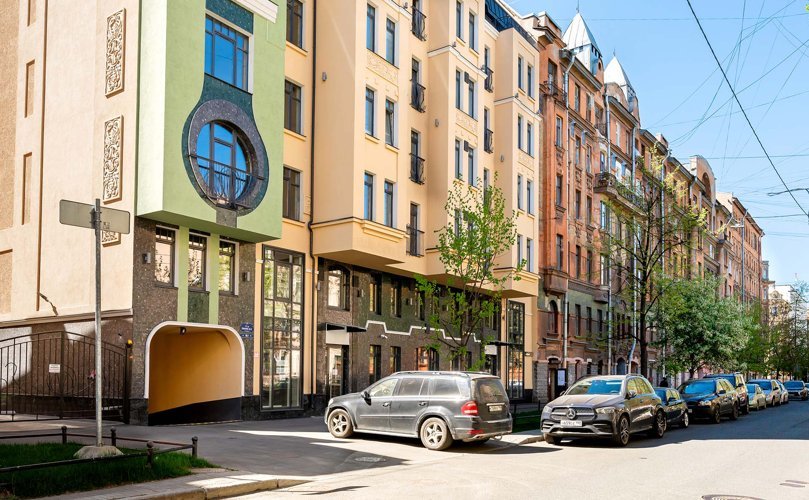 Современная интерпретация классического петербургского стиля. Фасад решен с использованием натурального камня, штукатурки и панорамного остекления. Лаконичный и строгий дизайн без излишеств.